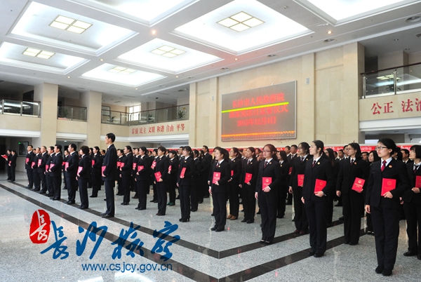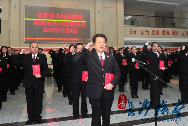 十二届全国人大常委会第十一次会议于2014年11月1日审议通过将每年的12月4日确定为“国家宪法日”。今天是第二个国家宪法日,在湖南省人民检察院统一部署下,长沙市两级检察机关统一举行检察官向宪法宣誓活动。此次检察官宣誓活动,旨在教育和引导广大检察人员严守宪法和法律,弘扬宪法精神,牢记宗旨和使命、坚定信念,忠诚履职,努力造就一支对国家忠诚、对人民热爱、对法律尊崇和对职责坚守的检察队伍。