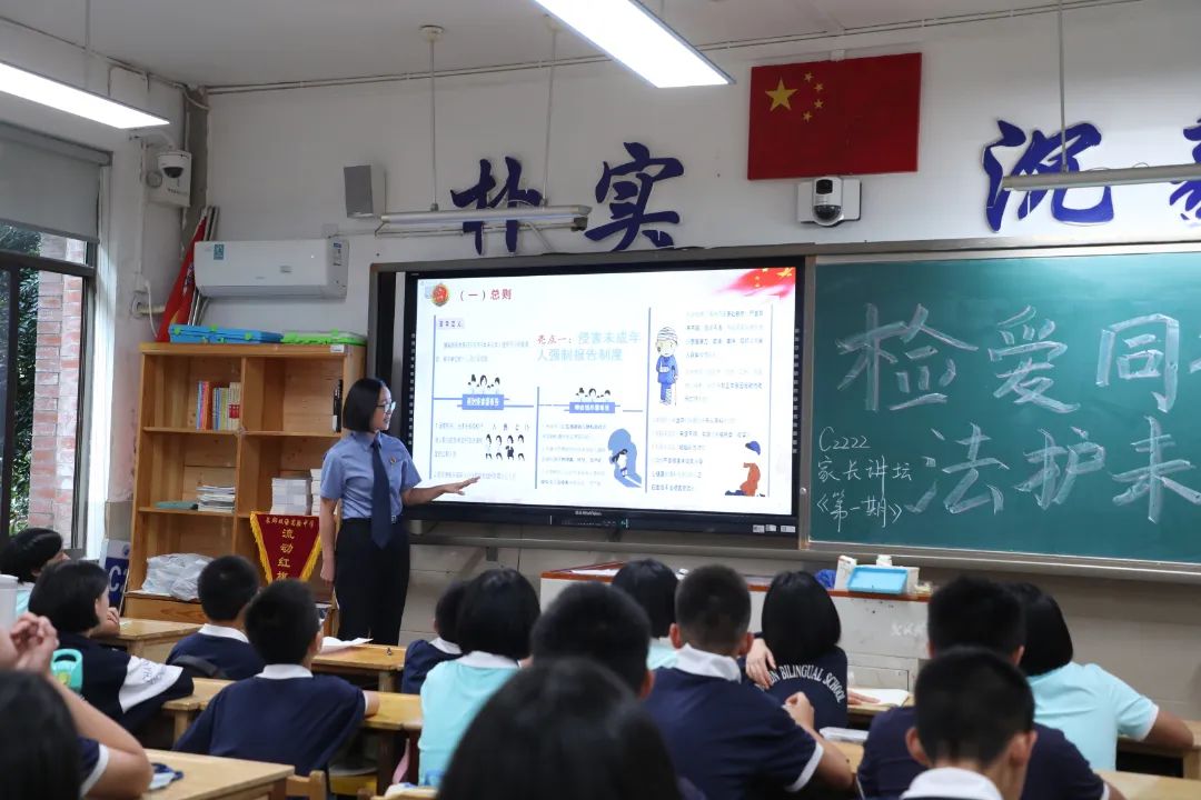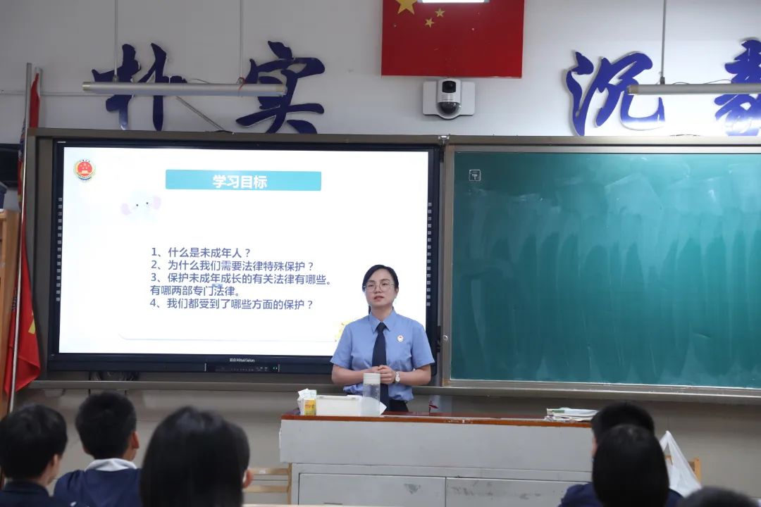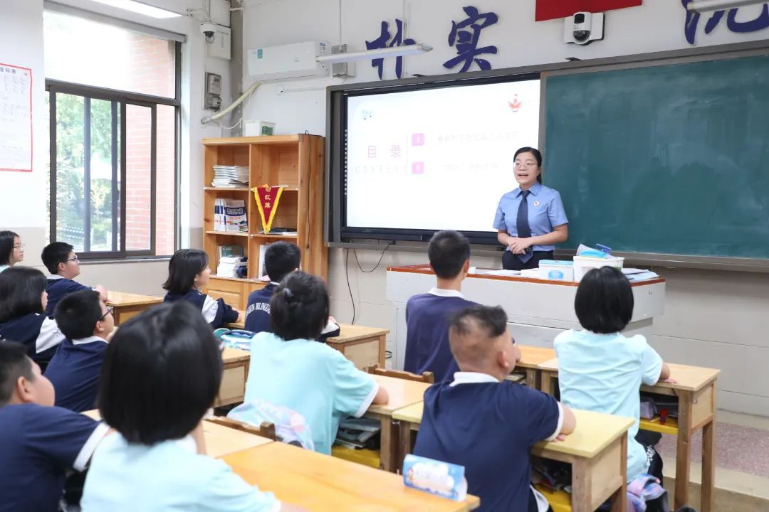 选派五名未检检察官再次走进初一年级课堂,通过以案释法、互动问答等方式,深入浅出地讲解了《未成年人保护法》确立的“最有利于未成年人的原则”和“六大保护”体系,课程内容干货满满,讲授形式亮点纷呈,在潜移默化之间将对法律的尊崇和敬畏根植于每一位学生心中,也让每一位学生有了更实在的安全感。